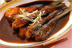 【特点】 著名上海风味菜。以青鱼尾巴(即划水)红烧而成。此菜工艺十分讲究,须经儿次颠翻而鱼尾不断,其难度很高。