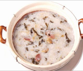 师傅教路:此粥虽香却不够鲜味,可加入用盐腌过两晚的咸瘦肉以增鲜;菜干一定要洗净,否则吃起来就满口小沙子了;怕寒的人士可放入2片姜驱寒。