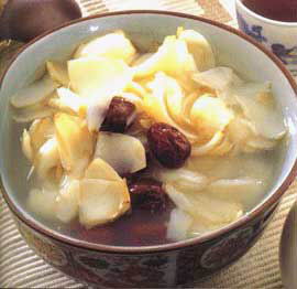 能生津、润燥、清热、化痰。古代医家多用之于食道癌、贲门癌和胃癌。如《滇南本草》云:“治胃中痞块食积。”《本草求原》也曾介绍:“治学业衰少,渐成噎嗝;梨汁同人乳、蔗汁、芦根汁、童便、竹沥服之。”《圣济总录》中还有一便方: “治反胃转食,药物不下; 大雪梨1个,以丁香15粒刺入梨内,湿纸包四五重,煨熟食之。”由于里所含的胡萝卜素、维生素B2、维生素C等都具有一定的防癌抗癌作用,所以梨还适宜鼻咽癌、喉癌、肺癌患者服食。