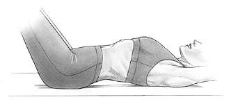 仰面躺在地上,膝盖弯曲,脚平放在地上,背部轻微弓起,就如左边所示。把你的注意力放在你的盆骨处和你的下腹部,在你的肚脐下方。把这处的肌肉拉起,向内,就像你在穿束腹一样。这个向上和向内的运动会让你的肚脐朝向你的脊椎,同时拉长你的身体,给你的肋骨和髋关节之间创造更多的空间。