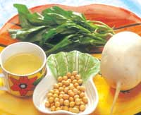 原料:白萝卜250克、菠菜250克、黄豆100克、盐少许。