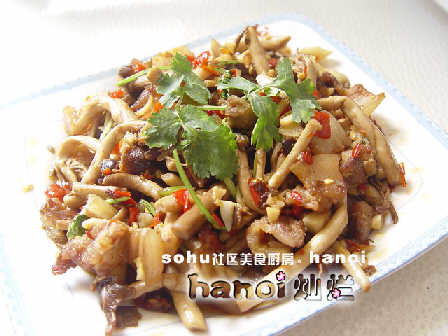 4.倒入茶树菇,放少许酱油、料酒、盐、鸡精,拌炒均匀。放一点点水,中火慢慢翻炒一会就可以装盘了。喜欢吃香菜的,最后可以加少许香菜。