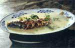 2、锅上火,放猪油、高汤、料酒、姜汁、盐,烧开后放入氽过的鱼,煮过5分钟左右,加味精、白醋、胡椒粉,随后把鱼捞出放入汤碗,上面放葱丝、香菜。