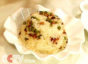 2、坐锅点火倒入油,待油热后先放入腊肉煸炒,再放入豌豆、糯米、花椒、盐反复煸炒,5分钟后倒入电饭锅中,加适量热水蒸熟即可;