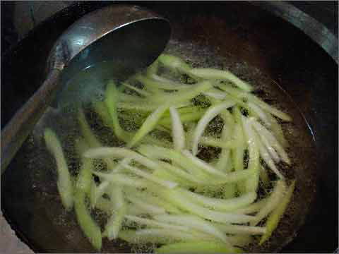 水开后,放点油和盐,盐是为了让菜入味,油是提高水的沸点,让菜烫一下,马上就可以熟,保持翠绿,这是关键,要拿笔抄下来,只要做凉菜时,会了这一点,别人就会对你刮目相看。好,水开了,把芹菜丝倒进去,大约20秒后,就可以捞出来,放冰水里过凉。