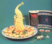 (2)用大盘一只,半岛南瓜雕刻成孔雀放在盘中间,再将炸好后的明虾放在 盘边即成。