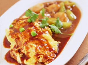 3.蛋汁煎成蛋皮放入炒好的饭后排盘,食用时再淋上少许番茄酱即可。