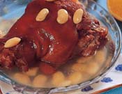 2. 取高压锅,在锅底垫上猪骨,放入肘子、神仙豆、姜、葱、八角、盐,加入冷鲜汤上火炖,至肘子和神仙豆皆烂时,拣去姜、葱,盛入盘子中,放入鸡精即成。