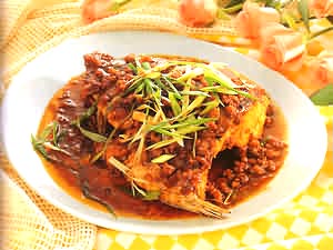 1、海鱼头洗净,对半剖开,擦干水分,用5大匙油两面煎上色后盛出;