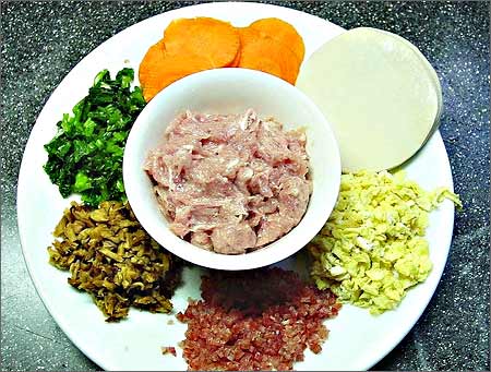 材料: 绞肉3两、腊肠末、香菇末、菠菜末各2大匙、煎蛋末1只、饺子皮10张、红萝卜10片休 闲 居编辑