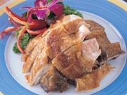 1 鸡洗净,抹上拌匀的A料,腌半小时,取出风干2小时,再放入蒸笼中蒸25分钟取出。