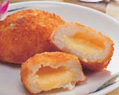 4. 每块土豆饼先沾一层淀粉,再沾一层打散的蛋汁后,裹上一层面包粉,放入温油中炸至酥黄。