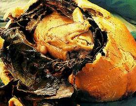 制作过程: 用酱油,料酒,精盐将鸡腌1小时,丁香粒,八角粒研成末擦抹鸡身。葱花,姜末,八角煸炒,加虾仁,猪肉丁,火腿丁,颠炒,烹入料酒,酱油,白糖,炒成馅料,填入鸡腹,猪网油紧包鸡身,荷叶包后再用玻璃纸,外面再包一层荷叶,用细麻绳扎成圆形。酒坛泥碾成粉,加清水拌和将泥裹在鸡上约五分厚,再用包装纸包裹放入烤箱,熟时取出敲掉泥去荷叶,淋上香油即可 。