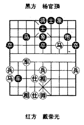 第二种战略:留炮破象。即跃马兑马,不吃士而破象,形成车炮对车马缺相的态势,红缺相怕炮,黑有取胜机会。这就是本局的实战着法,是战略上的明智选择。着法黑先: