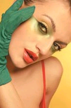 画眼影技巧 使用手指将大片的芥末绿金色眼影膏铺满整个眼眶,并向着颧骨方向晕染开,使之在与肌肤过渡处呈现出本来的黄色,睫毛根部使用黑色眼线笔画出类似长长卵形叶柄的眼线,加深轮廓。因为眼唇色彩强烈,将眉用淡咖色眉粉淡化处理,将睫毛用纤维睫毛膏拉长,以突出眼睛轮廓。
