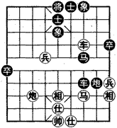 [棋例]1981年全国团体赛,山东王秉国对浙江陈孝坤,弈至第26回合时的形势如图。双方以中炮进七兵对后补列炮布阵。双方子力相等,现在轮黑方走子。请看黑方是如何“以逸待劳”,积极防御,伺机反击,夺取胜利。
