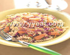 (3)将所有食材、螺旋义大利面及调味料拌匀,盛入盘中,即可上桌食用。