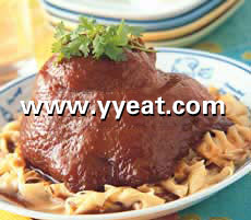 (3)将油锅中的热油倒出,只留1大匙左右的油量,烧热后,放入葱段爆香,再放入蹄膀、调味料1,然后加水,水的份量需盖过蹄膀,煮至蹄膀肉质软烂。