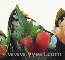 [原料/调料] 鲔鱼肉(生鱼片用) 适量 紫苏叶 2片 山葵酱 少许 寿司饭 少许 海苔(大) 1/2片 [制作流程] 1.将鲔鱼肉切成条状备用。 2.将海苔用火微烤,舖上少许寿司饭,涂上少许山葵酱,再放绿紫苏叶、鲔鱼条,然后捲成圆锥状即可。 休 闲 居编 辑