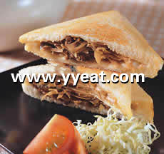 (4)取2片土司,中间包入牛蒡烧肉,四周涂上面粉及水(1:1)调成的面煳,再以手指轻轻按压封边,放进锅中用奶油煎至两面皆呈金黄色。