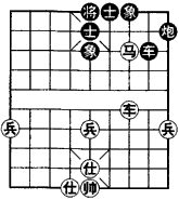 如图残局,红虽多三个兵,但缺双相,黑方用支士困马的战术手段,车炮发威,谋子取胜。着法黑先: