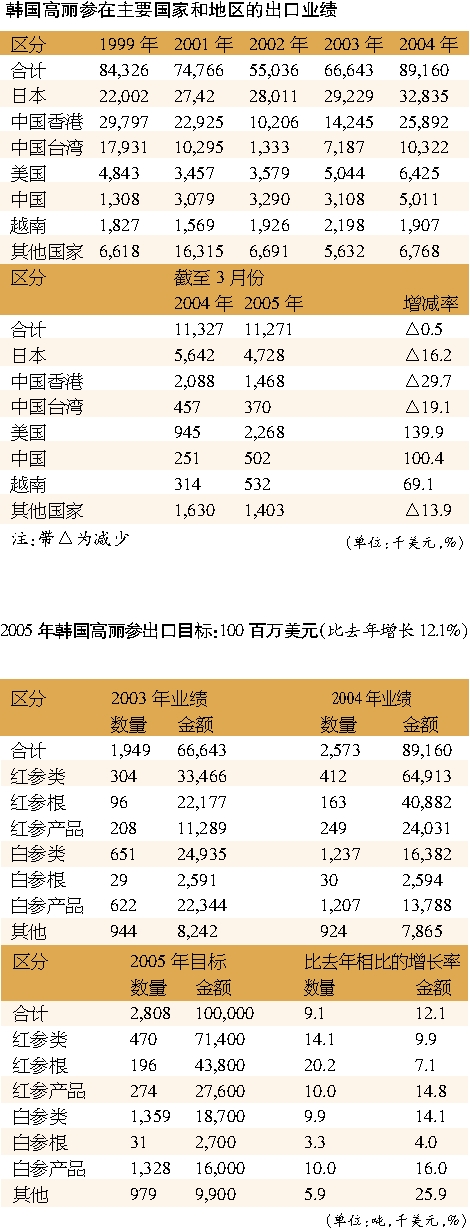 韩国高丽人参出口的80%集中在日本、香港、台湾、美国等四大市场,向中国、东南亚等地区的出口呈现增加趋势。2004年高丽参出口额为89.2百万美元,2005年的出口目标预计要比前年增长12.1%,达到100百万美元。为此韩国有关机构正在加强海外市场营销,比如在主要出口国家举行高丽参研讨会,此次在北京举行的研讨会就是其中之一,其目的就是重点宣传改善中国消费者对高丽参有发热效能,热天不能食用的错误认识。在日本和美国市场则重点宣传高丽参效能效果的优秀性。韩国的人参出口企业还采取了适合当地市场特性的媒体持续宣传高丽参的优秀性。此外,他们还计划联系主要出口国家的流通企业,大力促进人参销售活动,同时邀请海外人参采购商进行出口宣传,参加韩国釜山人参节等活动。