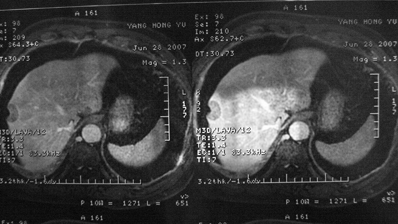 第三层:从X光片看,在肝脏偏下部位有一肿瘤生成.