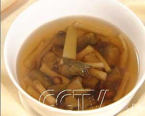 【解说】切一些葱段儿,姜片,把党参也切段儿。把它们连同葛根一起放入装有黄鳝的碗里,再加入盐,绍酒,酱油拌匀,加入高汤300毫升。最后,放入蒸锅用大火蒸25分钟。这样,这道美味可口的党参葛根蒸黄鳝就做好了。这道药膳具有滋阴补气的功效,我们建议您每日服用1次,每次吃黄鳝30——50克。