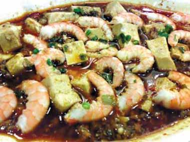 材料:豆腐、虾仁、豆瓣酱、辣椒碎、蒜茸、葱花、二汤、酱油、黄酒、盐、糖、胡椒粉、菜油。