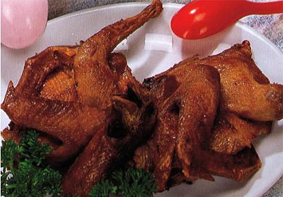 2、锅上火放油烧热,投入鸽子炸至表皮酥脆,捞出,改刀装盘即成。